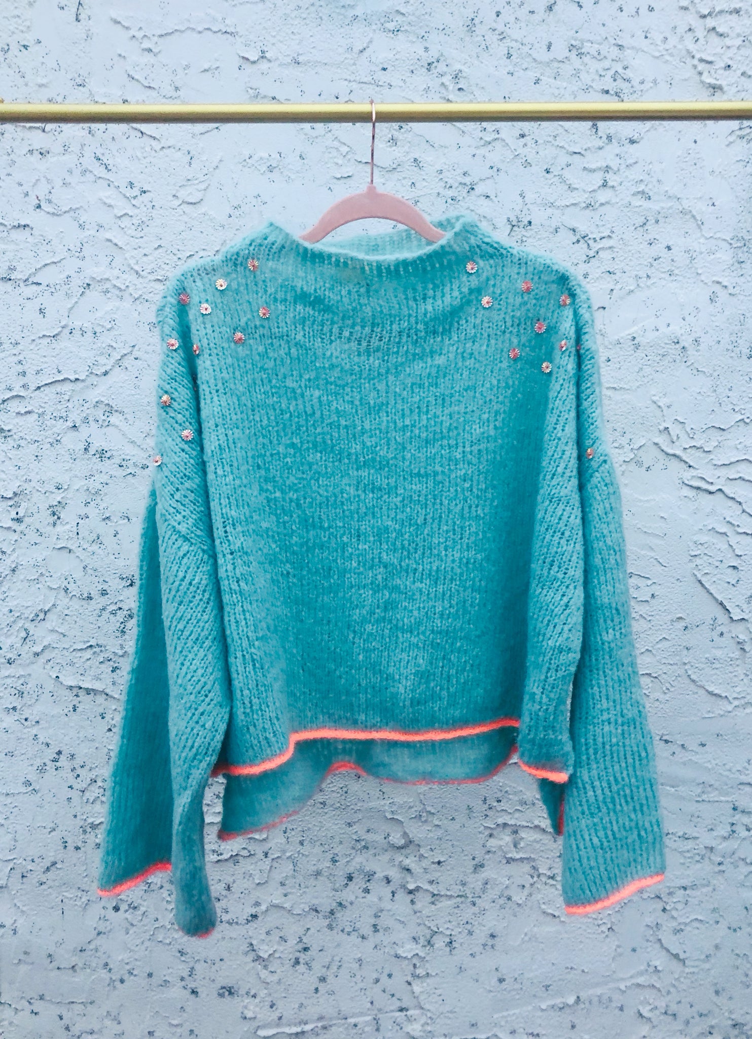 A lofty, luxe mock neck pullover with a high-low hem. It's meant to fit with extra space to store all your hopes a dreams.